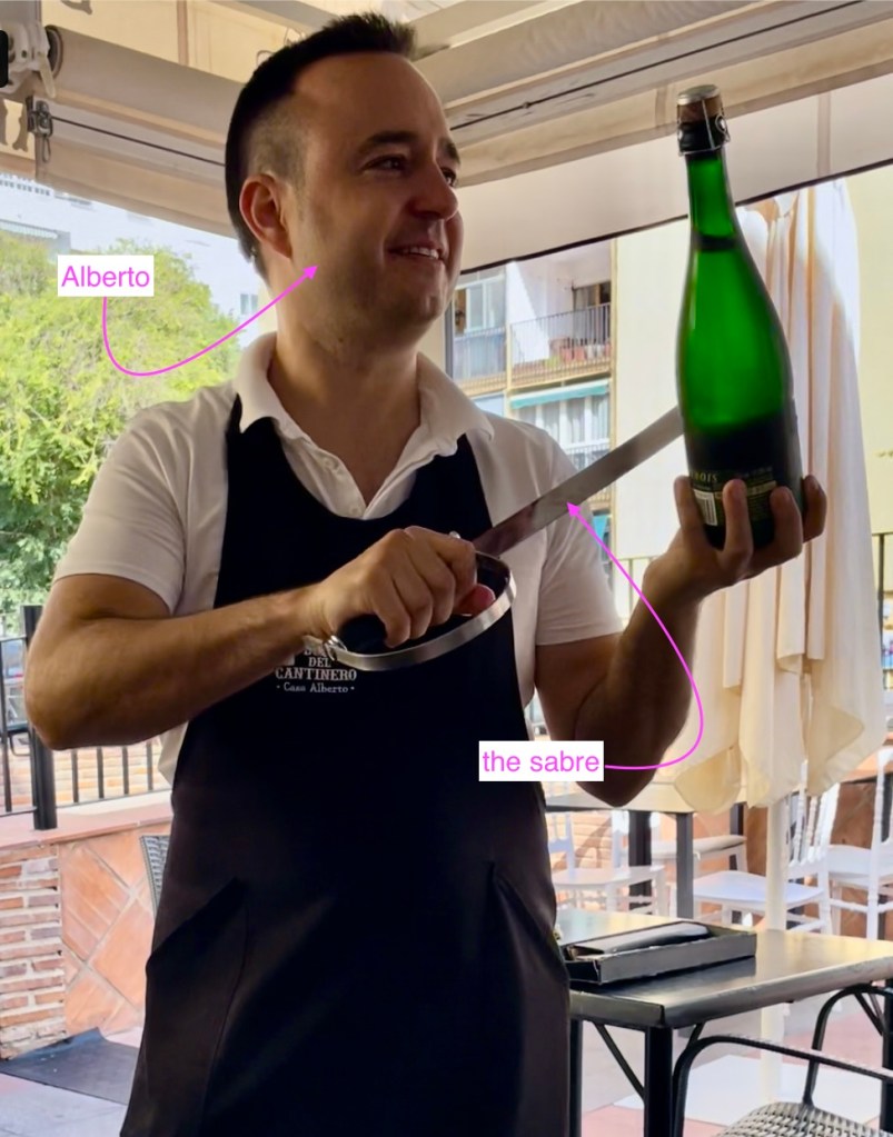 By the time DESSERT was served, we were part of the flamenco party, and Alberto was opening bottles of cava (Spanish champagne) with a large, shiny stainless-steel sabre (an act undertaken with much fanfare, called ‘sabrage’).